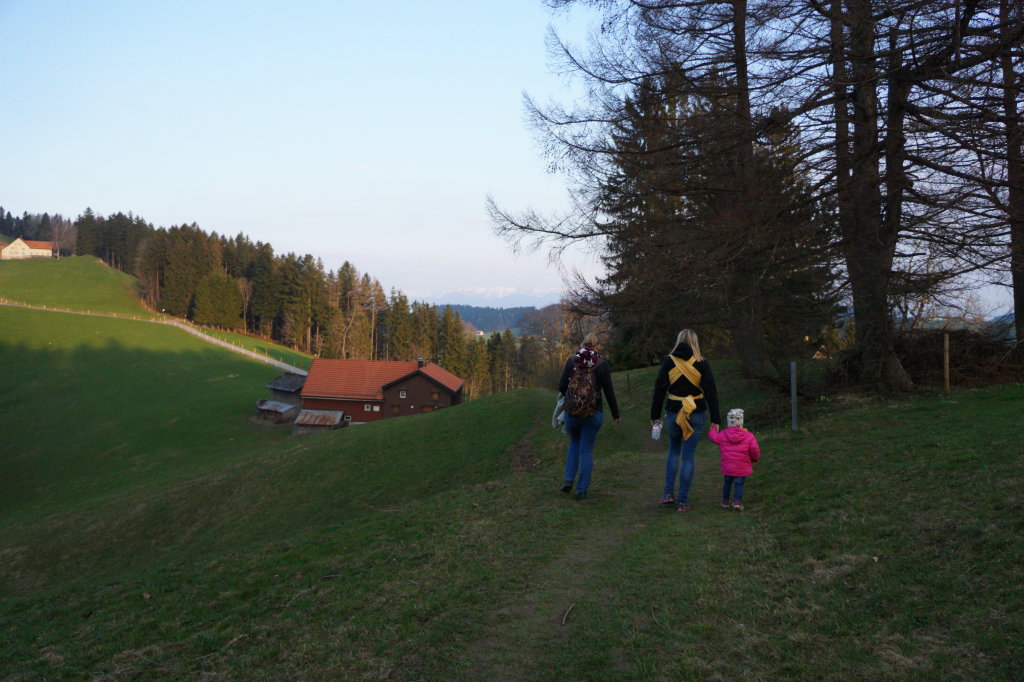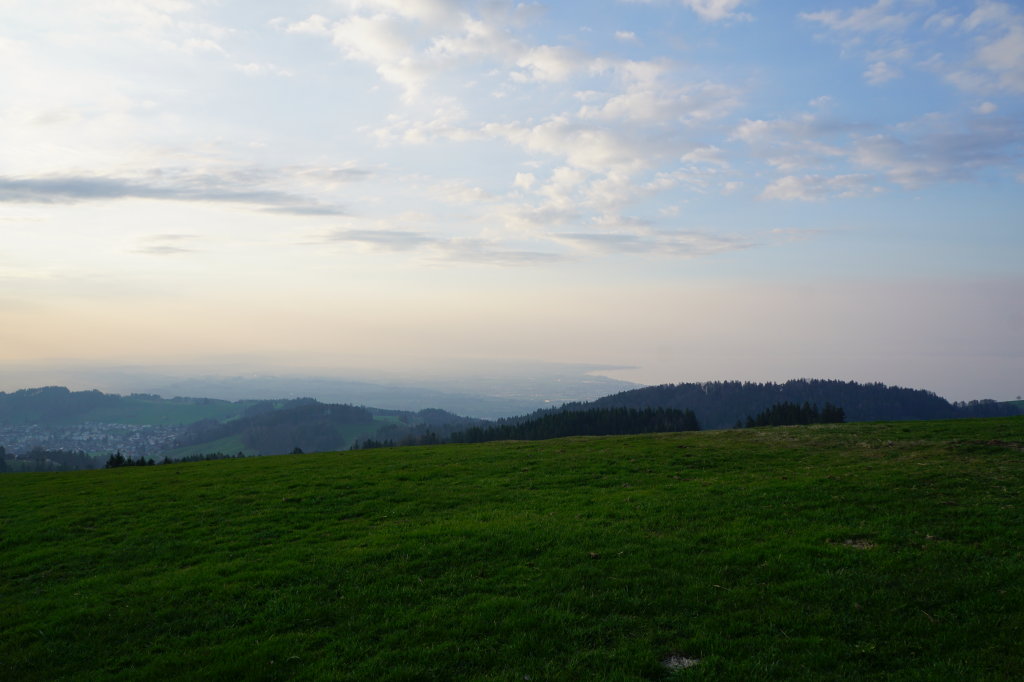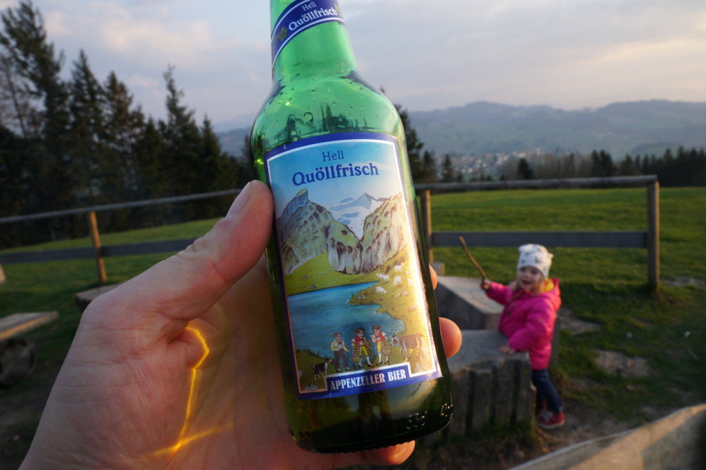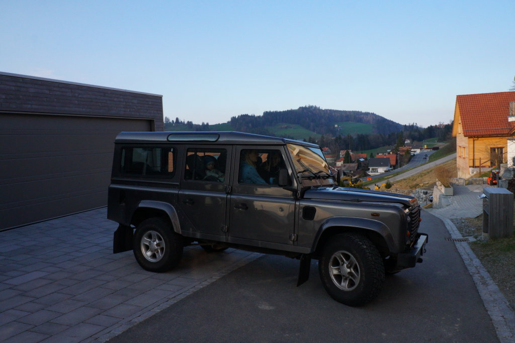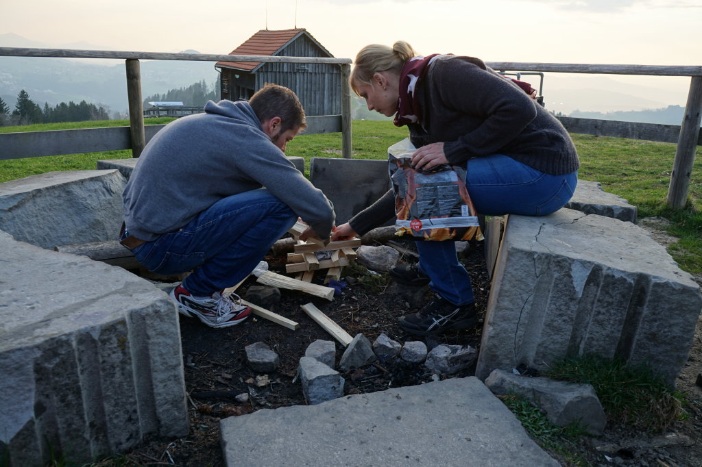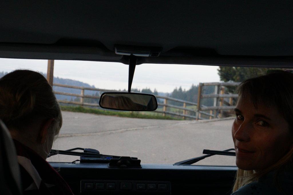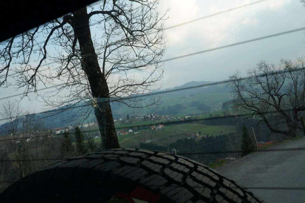 Dann noch bissle in den Schweizer Hügeln gekurvt, den Bodensee von oben angeschaut und ein paar mal die Straße zum Zielort verfehlt da sie nicht im alten Navi war. Hier und da musste Papa deshalb in den engen Straßen und Gassen umdrehen – na ja, ging soweit gut. Sabse hat uns dann super freundlich in ihr Heim aufgenommen und hatte auch ne top Idee für den Abend! Wir machten alles in einem Rutsch, wir fuhren im Jeep (Papa wie der Hund im Laderaum), wir gingen wandern, Feuer machen, Stöcke schnitzen, Würste und Gemüsespieße grillen, Stockbrot backen und die Erwachsenen haben den örtlichen Gerstensaft verkostet. Sabse hatte alles vorbereitet – vielen lieben Dank noch mal dafür! Es war herrlich, mit genialem Ausblick auf den Bodensee wenns auch leider bissle diesig war an dem späten Nachmittag was den Blick auf den Säntis verwehrt hatte.