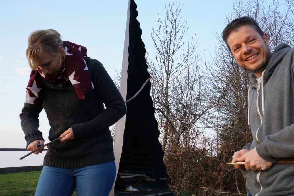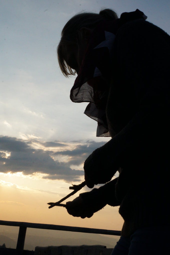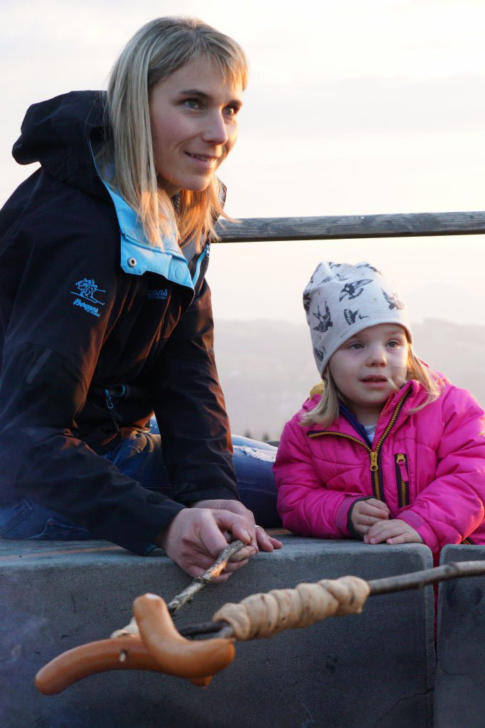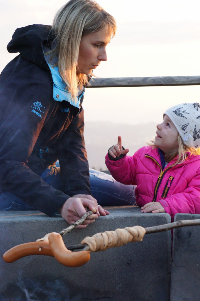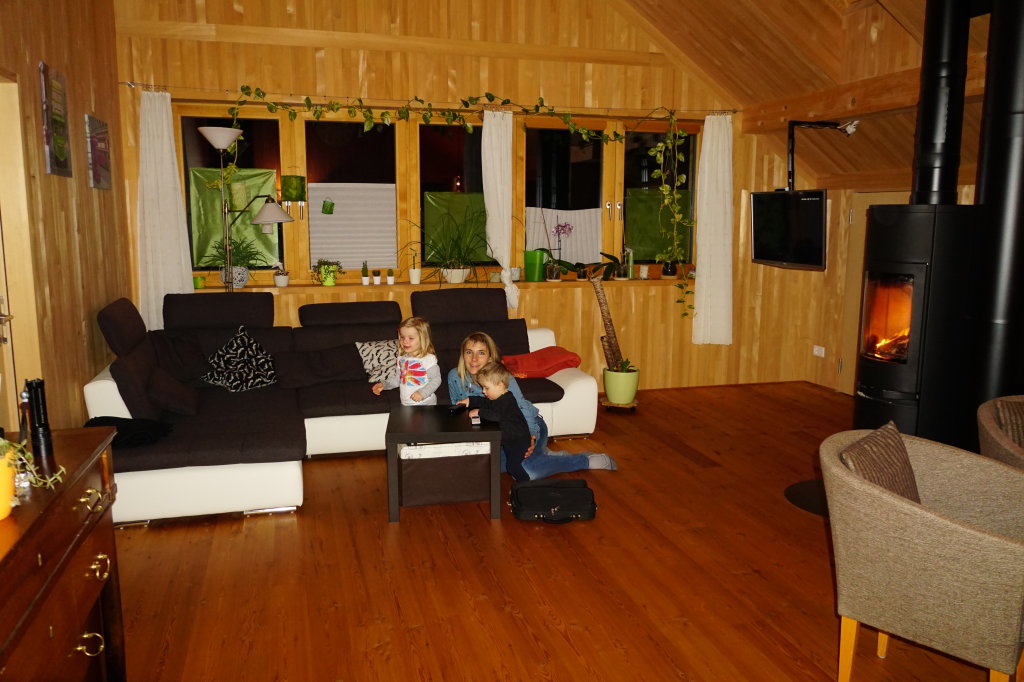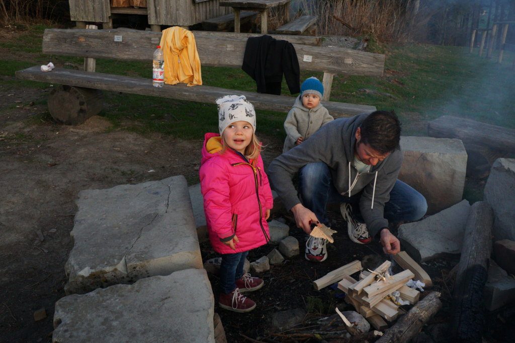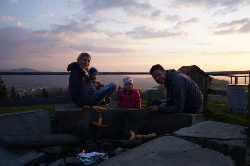Dann noch bissle in den Schweizer Hügeln gekurvt, den Bodensee von oben angeschaut und ein paar mal die Straße zum Zielort verfehlt da sie nicht im alten Navi war. Hier und da musste Papa deshalb in den engen Straßen und Gassen umdrehen – na ja, ging soweit gut. Sabse hat uns dann super freundlich in ihr Heim aufgenommen und hatte auch ne top Idee für den Abend! Wir machten alles in einem Rutsch, wir fuhren im Jeep (Papa wie der Hund im Laderaum), wir gingen wandern, Feuer machen, Stöcke schnitzen, Würste und Gemüsespieße grillen, Stockbrot backen und die Erwachsenen haben den örtlichen Gerstensaft verkostet. Sabse hatte alles vorbereitet – vielen lieben Dank noch mal dafür! Es war herrlich, mit genialem Ausblick auf den Bodensee wenns auch leider bissle diesig war an dem späten Nachmittag was den Blick auf den Säntis verwehrt hatte.