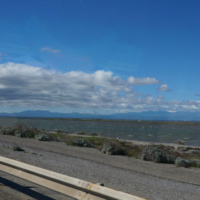 Die gestern noch so widerspenstige Schranke hat uns heute nach Eingabe des auf dem langen Zettel stehenden Codes ganz easy wieder rausgelassen und wir waren wieder “on the road”. Das Wetter war fabelhaft und wir hatten gute Sicht auf die Berge und die Dörfer links und rechts. Ich sah zum ersten mal so Leute die auf einem Brett stehend mit den Händen an nem Segel übers Wasser rasten. Das scheinte denen echt Spaß zu machen bei dem immer noch stark wehenden Wind.