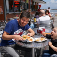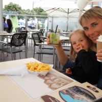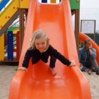 Davor war Juna natürlich noch auf dem Spielplatz an den sie sich noch von der Herfahrt gut erinnern konnte. Das war Pflicht. Wir waren auch noch in einem Straßenkaffe und bei dem kleinen Fest mit Musik und dem Holzkohlegrill an den sich Papa noch so gut erinnern konnte… Da gabs noch was von dem riesen Schweinehaxen den die da von Hand seit Stunden über dem Holzkohlegrill drehen und immer wieder mit so einem Kräuterwedel mit gewürztem Öl einpinseln. Es werden immer wieder portionsweise dünne knusprige Scheiben abgeschnitten und auf einem weichen Semmel serviert. Dieser herzhafte Teil unserer kulinarischer Tests war auch verdammt lecker gewesen.