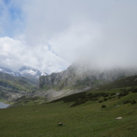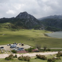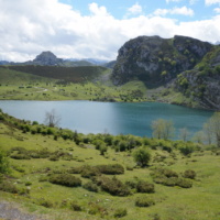 Von Covadonga schlängelt sich die Straße über 12 Kilometer hinauf zu den Bergseen, vorbei an wunderbaren Aussichtspunkten Der Blick reicht weit über das Küstengebirge bis hin zum Meer. Auf den grünen Weiden grasen Kühe und Schafe. Nach der Überquerung eines Passes liegt zur rechten Seite der tiefblaue Lago Enol vor dem Panorama des westlichen Massivs der Picos de Europa mit dem 2.594 Meter hohen Berg Torre Santa.