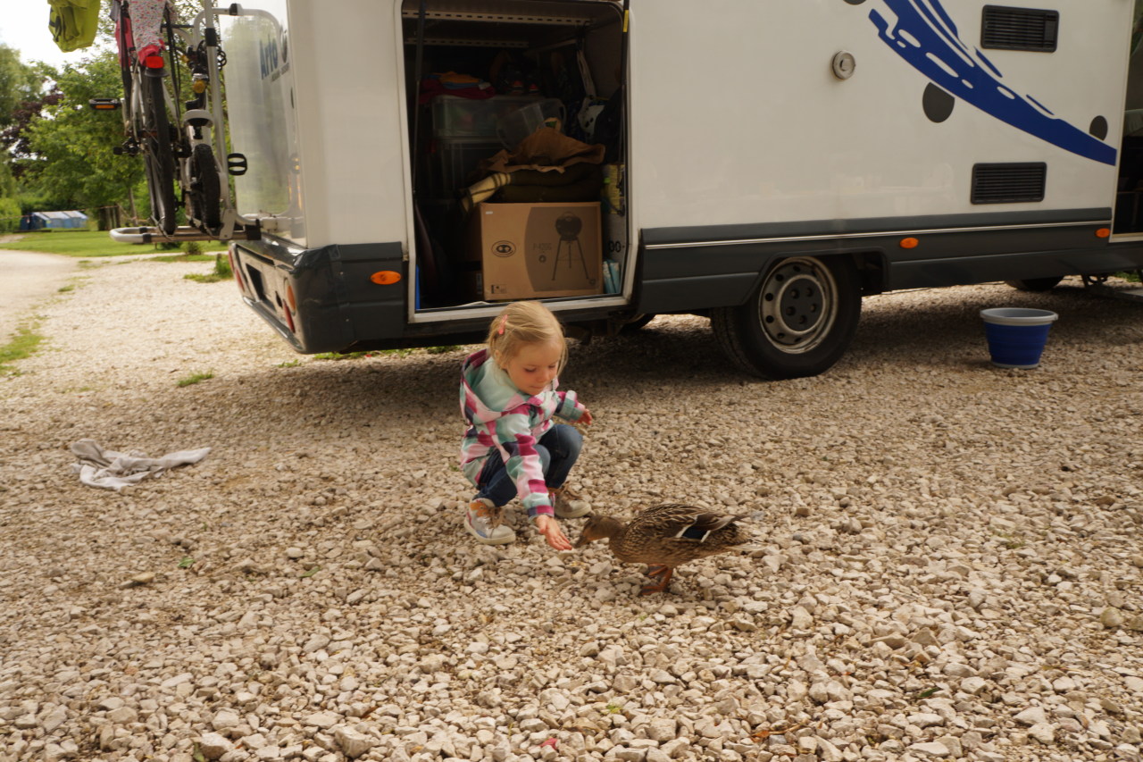 Wir hatten auf dem Platz immer wieder eine Entenfamilie zu Besuch was mir und Juna viel Freude bereitet hat. Eigentlich war meistens nur die Ente da aber als Juna den Erpel gerufen hatte passte das wie die Faust aufs Auge und er kam dahergeflogen. Wir nannten sie Duckie und Erpi. Die Ente Duckie hat uns aus der Hand gefressen aber der Erpel Erpi war da etwas schüchterner und blieb auf Respektabstand.