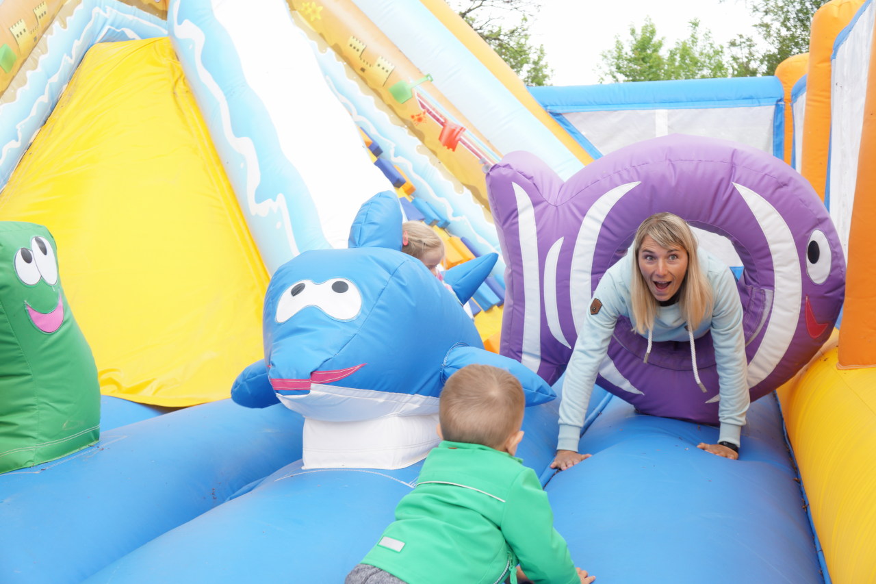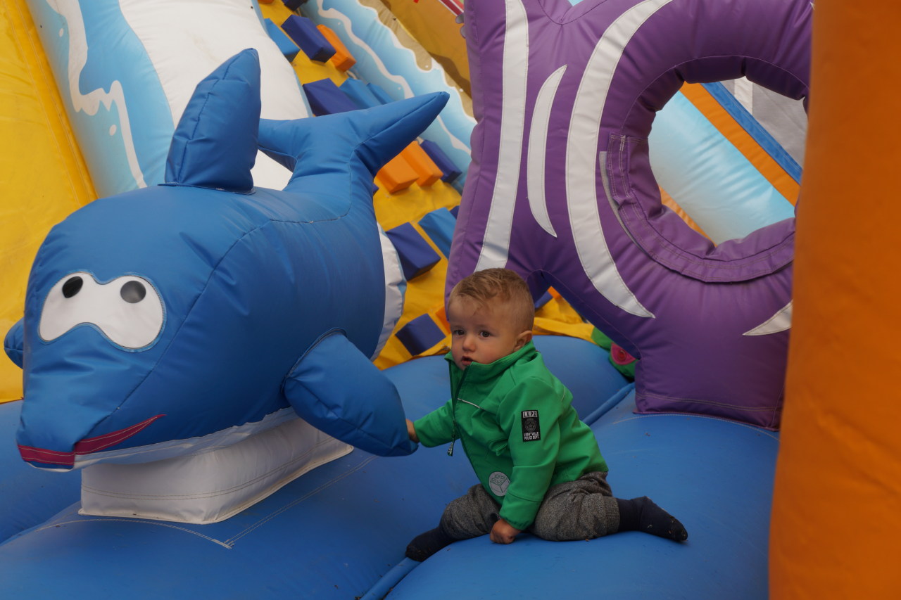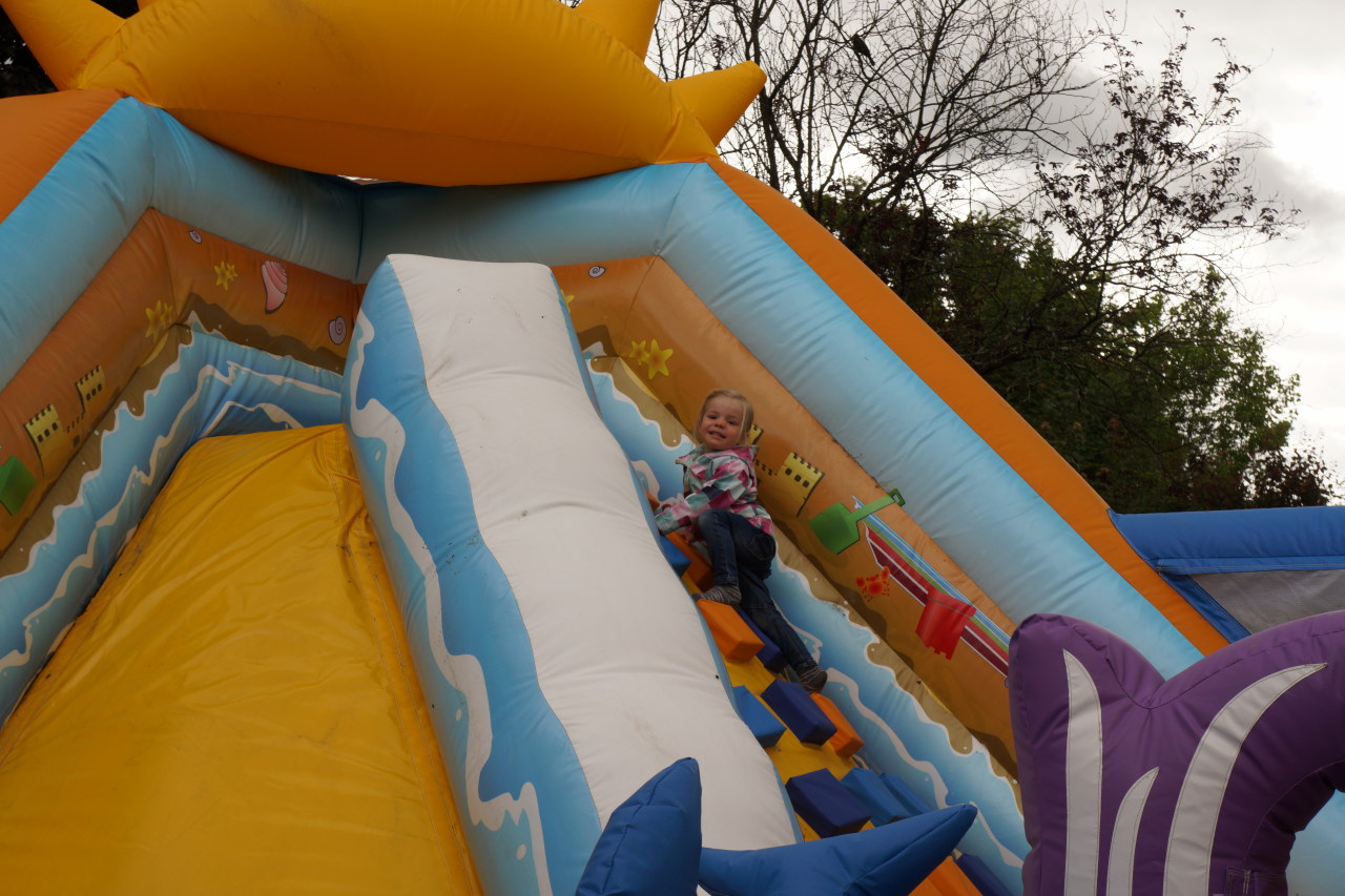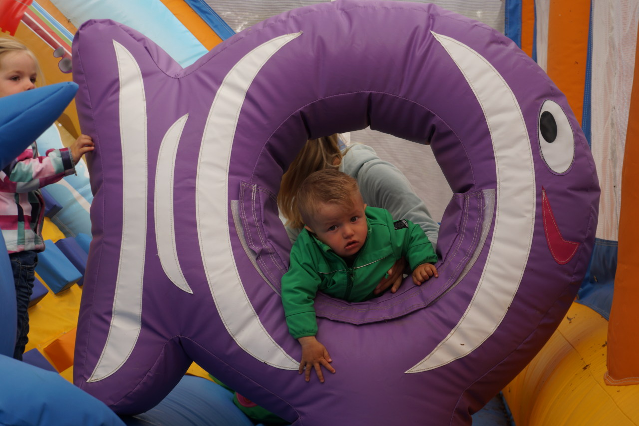 Gestern abend meinte Juna noch dass die Hüpfburg neben dem Trampolin bestimmt heute aufgeblasen wird uns sie morgen darin rumtoben kann. Mama sagte dass sie sich besser nicht darauf freuen solle weil es ja grad eher schlechtes Wetter war und die Hüpfburg wahrscheinlich wegen dem großen Hotelbus weggeräumt wurde. Aber Juna sollte Recht behalten. Sie kam plötzlich ganz aufgeregt von einer ihrer Spazierfahrten zurück und erzählte dass jetzt die Burg aufgeblasen sei und sie wolle sofort da rein. Gesagt getan – solange es trocken war musste die Zeit ja genutzt werden.