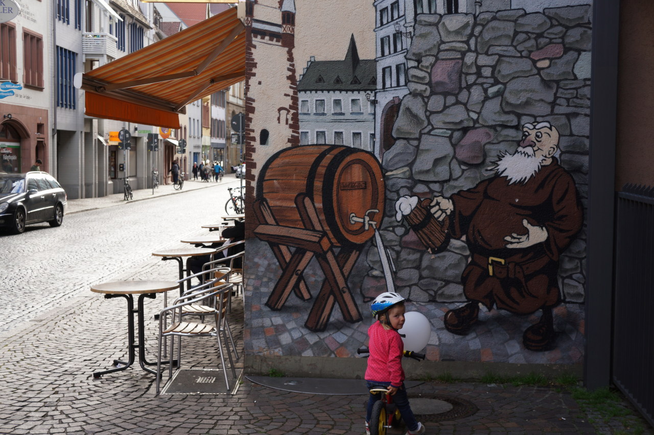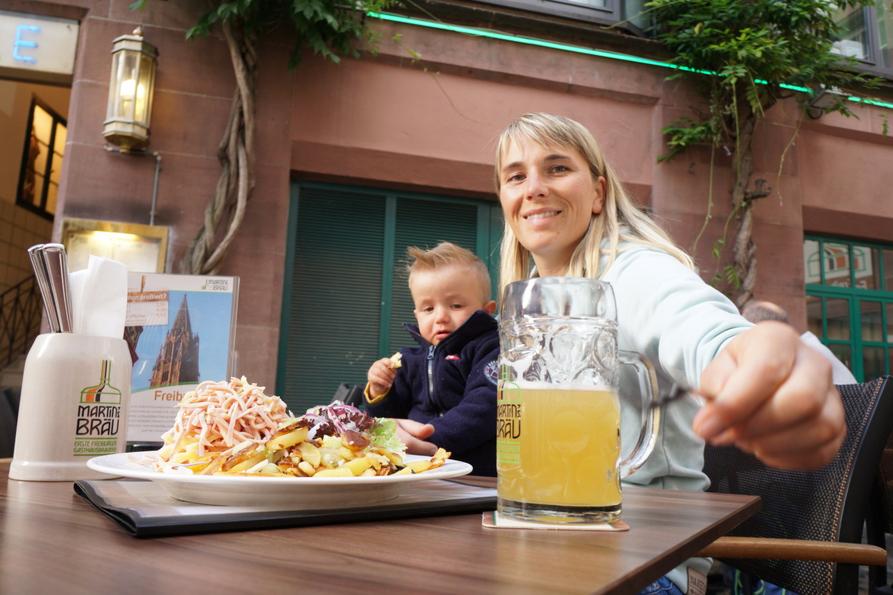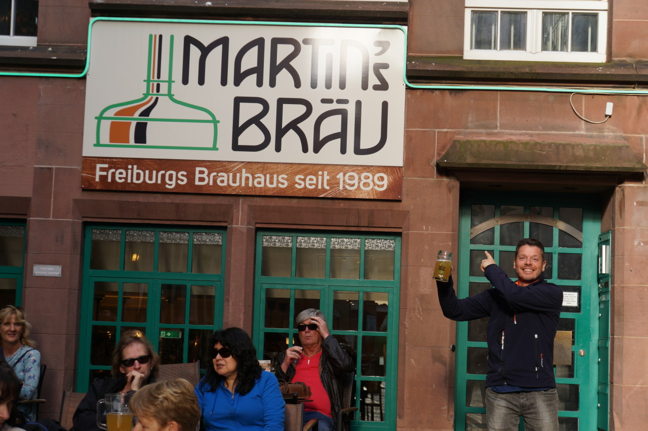 Nach einem Weilchen hin und her ob wir noch mit der S- Bahn in die Stadt fahren sollten entschieden wir uns dafür. Die nächste S- Bahn- Station lag nur wenige Gehminuten entfernt und die Fahrt ins Zentrum dauert ebenfalls nicht lang. Das Wetter war gut und wir fanden Freiburg auf den ersten Blick schon sehr beeindruckend. Wir waren unter anderem in der Martins- Brauerei einkehren. Papa war sehr angetan vom hausgemachten, naturtrüben und gehaltvollen Bier das er so die letzen Wochen nie bekommen hat. Da musste er gleich noch ein Weizen probieren und auch das war gut 🙂 Er fand in Spanien, Portugal und Frankreich zwar einige Biere die ihm schmeckten aber das hier war schon irgendwie wieder was ganz anderes. Auch der Wurstsalat und die dicken hausgemachten Pommes waren superlecker!