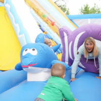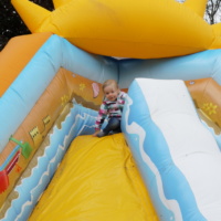 Gestern abend meinte Juna noch dass die Hüpfburg neben dem Trampolin bestimmt heute aufgeblasen wird uns sie morgen darin rumtoben kann. Mama sagte dass sie sich besser nicht darauf freuen solle weil es ja grad eher schlechtes Wetter war und die Hüpfburg wahrscheinlich wegen dem großen Hotelbus weggeräumt wurde. Aber Juna sollte Recht behalten. Sie kam plötzlich ganz aufgeregt von einer ihrer Spazierfahrten zurück und erzählte dass jetzt die Burg aufgeblasen sei und sie wolle sofort da rein. Gesagt getan – solange es trocken war musste die Zeit ja genutzt werden.